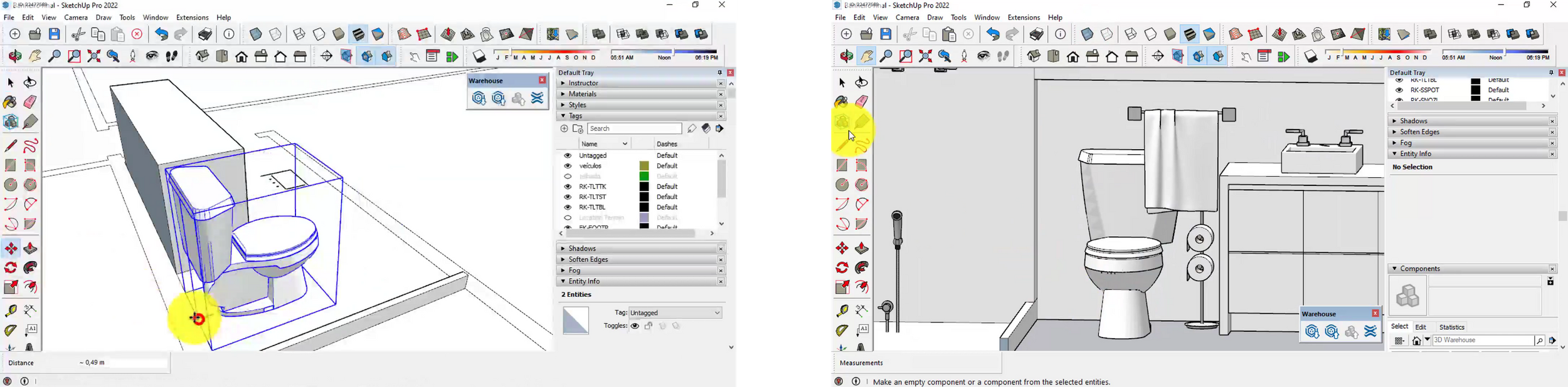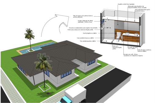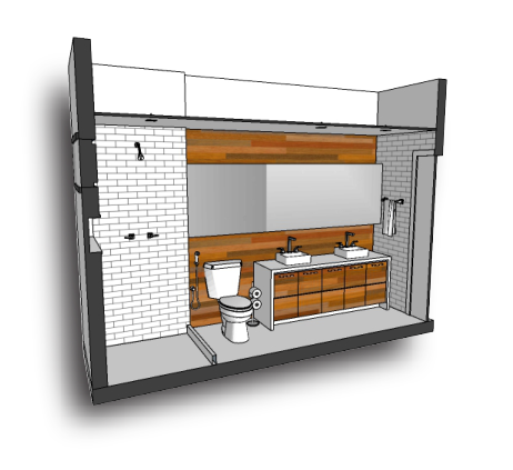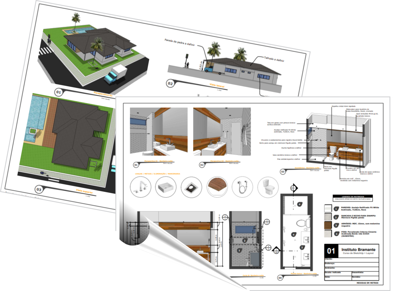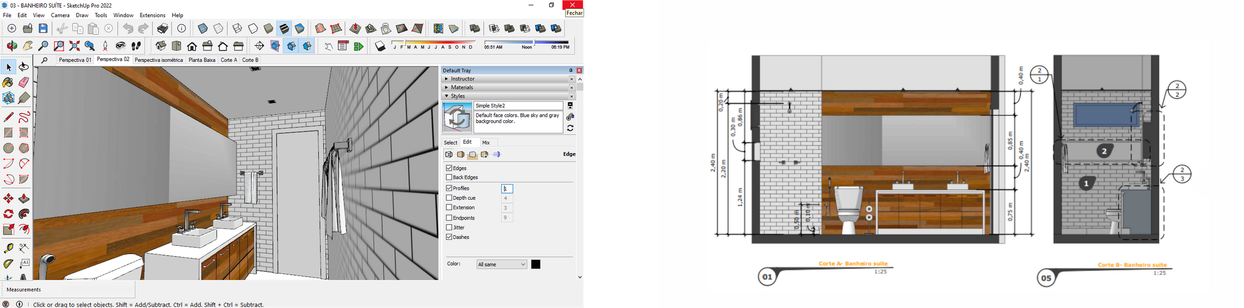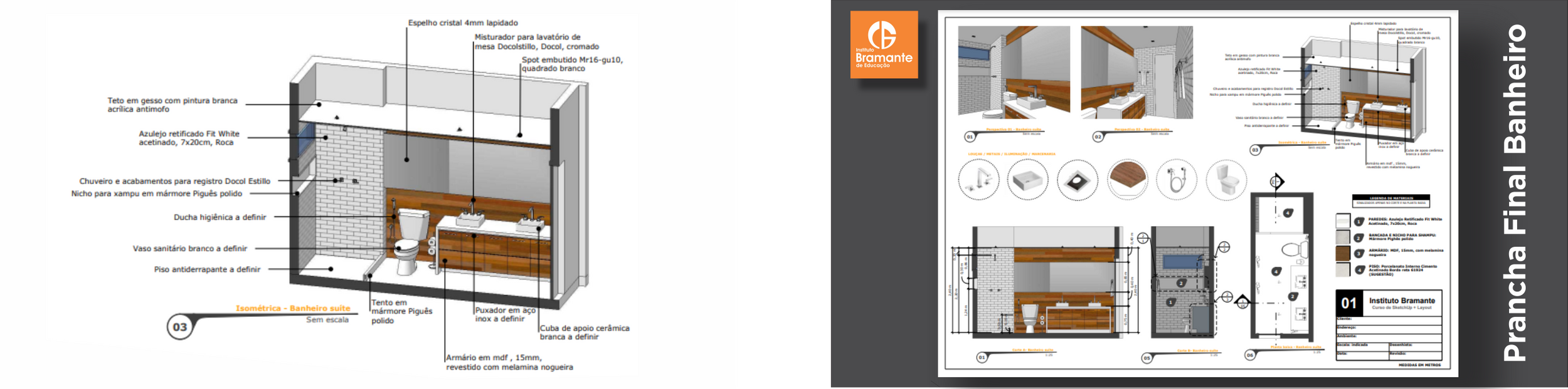 Desenvolveremos o banheiro da suíte completo modelando bancada, marcenaria, espelho, tento, ralo, nicho, teto e porta, inserindo e posicionando metais e toalheiros. Criaremos cenas importando-as para nossa prancha final A2, no Layout. Esta prancha conterá 02 perspectivas cônicas, 01 isométrica com linhas de chamada e especificações, 02 cortes, 01 planta baixa, numerações de desenho no padrão ABNT, legenda de materiais, carimbo e margem.