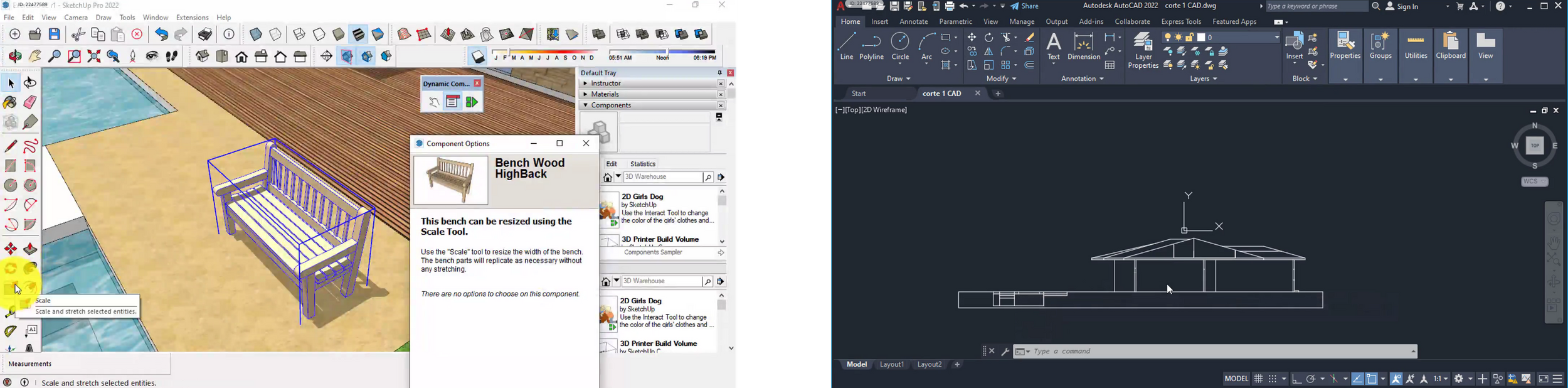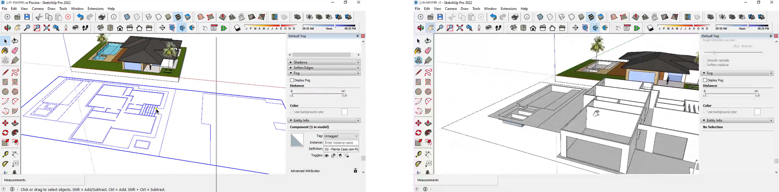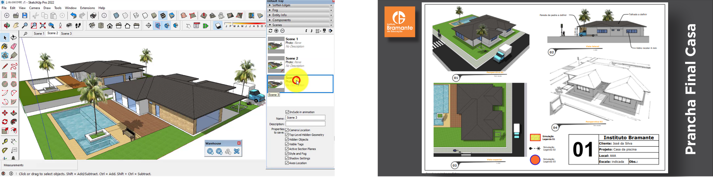 Importaremos uma planta do CAD, levantando no SketchUp paredes, janelas, pergolados, canteiro, piscina, telhado, calçada e rua com sinalização. Faremos o estudo solar após geolocalizar o imóvel no mapa real. Em seguida trabalharemos a texturização, cortes, componentes, animações e exportaremos o arquivo para o Layout onde montaremos uma prancha completa.